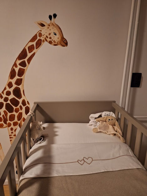 Voor een babykamer schilderde ik een warme, realistische muurschildering met als thema jungle. De wens van de mama: een vrolijk aapje en nieuwsgierige giraffen, die op een speelse manier aansloten bij het ledikantje en de commode.
